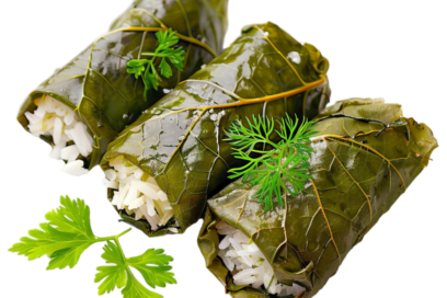Viininlehtikääryleitä täytteenä riisiä, sipulia ja yrttejä tuore leipää (3 kpl).