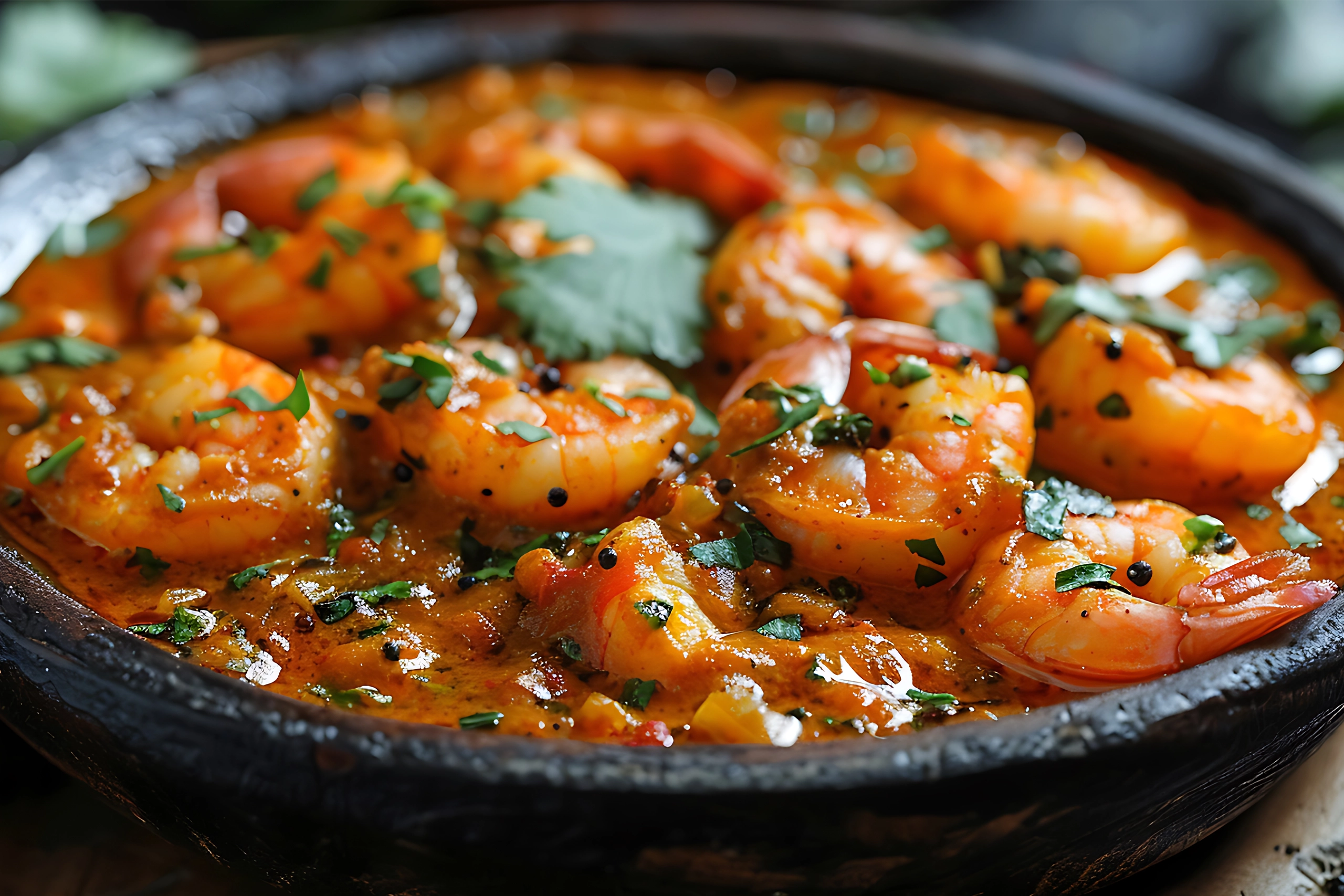 Savipadassa paistettuja jumbokatkarapuja, sipulia, herkkusieniä (kauden mukaan kanttarellejä), haudutettuja vihanneksia ja basmatiriisiä.
