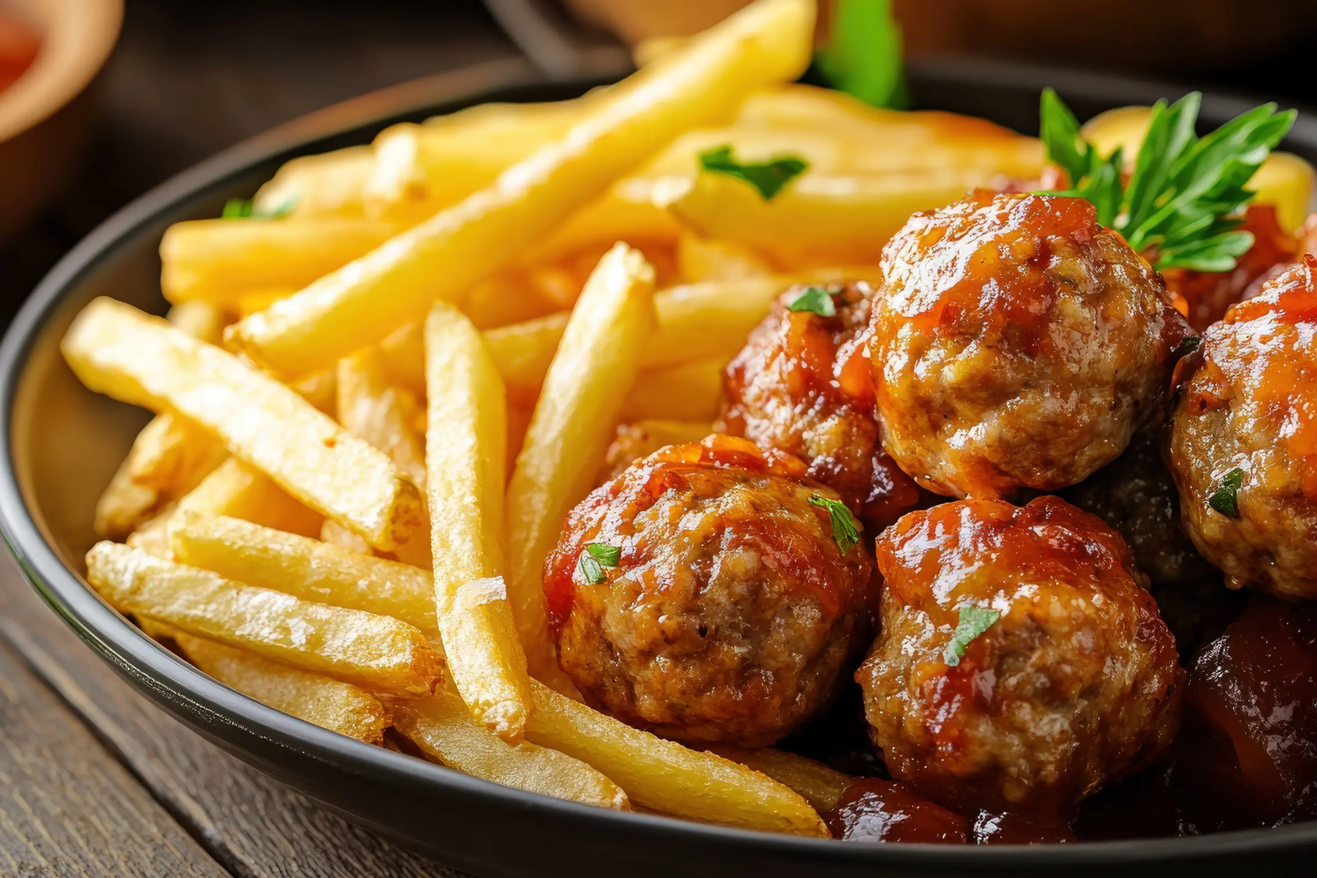 Lihapullat ja ranskalaiset tai riisiä.