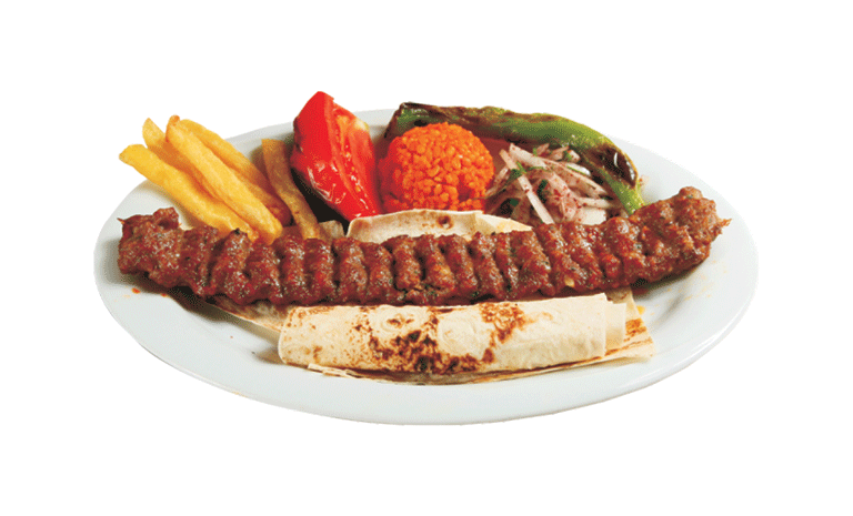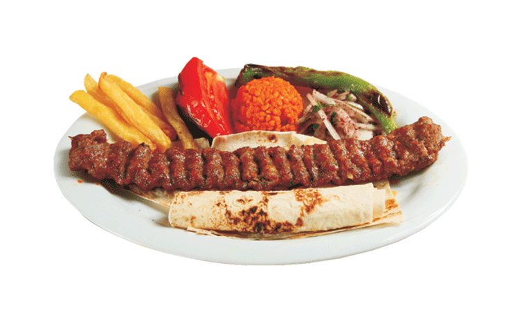Jauhelihasta talon tapaan valmistettua kebabia. Voissa paistettua talon leipää, sipulisalaattia, tomaattikastiketta, valkosipulijogurttia.